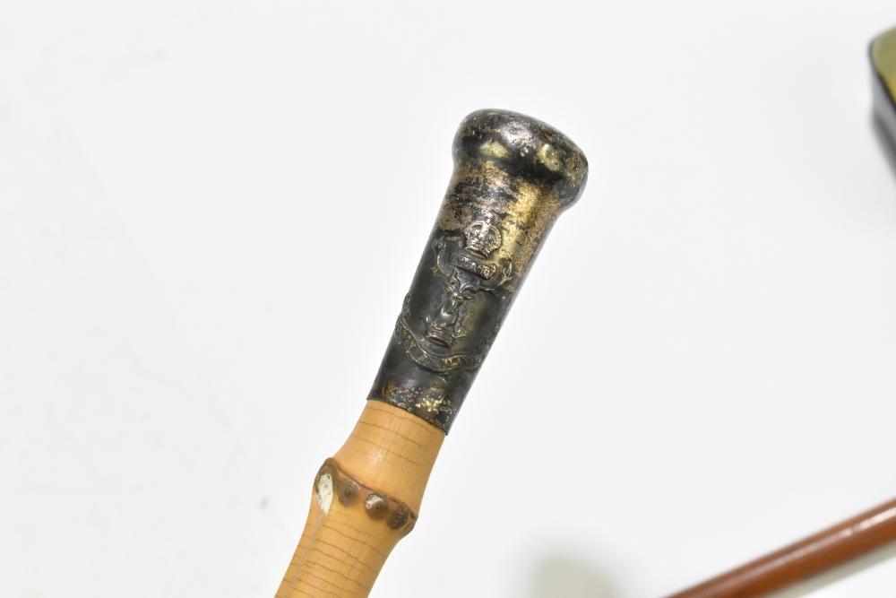 Lot 1311 of 1739: GORDON HIGHLANDERS; a crop stick with silver plated mount, length 70cm, and a similar swagger stick, length 70.5cm, also a Victorian papier-mâché snuff box with printed decoration depicting a cockerel and chick, 'Does Your Mother Know You're Out', length 9cm (3).