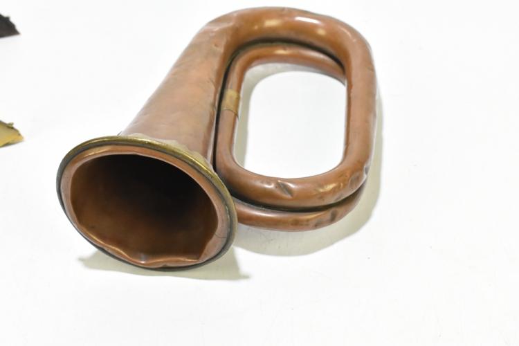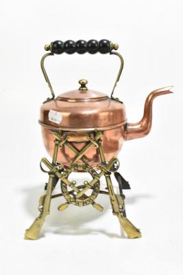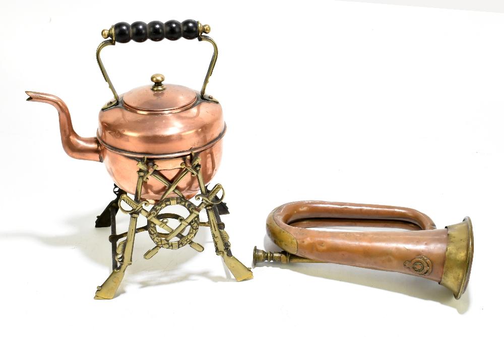 Lot 1312 of 1739: A military brass trumpet for the George Potter & Company of Aldershot, length 26cm, also an unusual copper kettle raised on brass stand with cast decoration depicting rifles and swords (2).