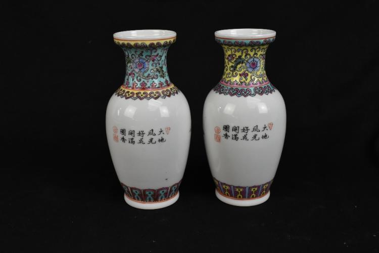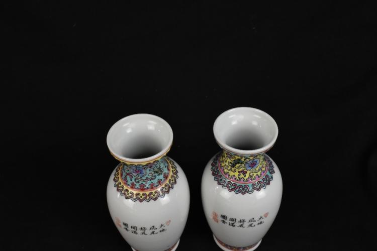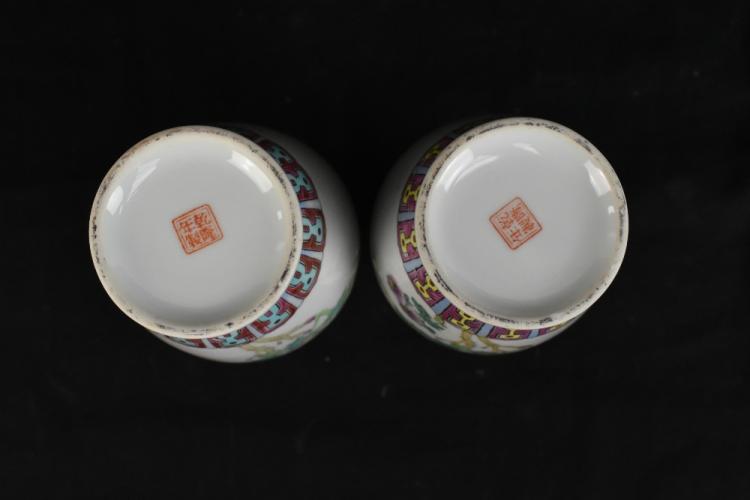 Lot 93A of 1739: A pair of 20th century Chinese Famille Rose porcelain vases with ruyihead motifs to the shoulder, the bodies decorated with birds and floral sprays, the reverse painted with characters, red seal mark to underside, height 17cm (2).
