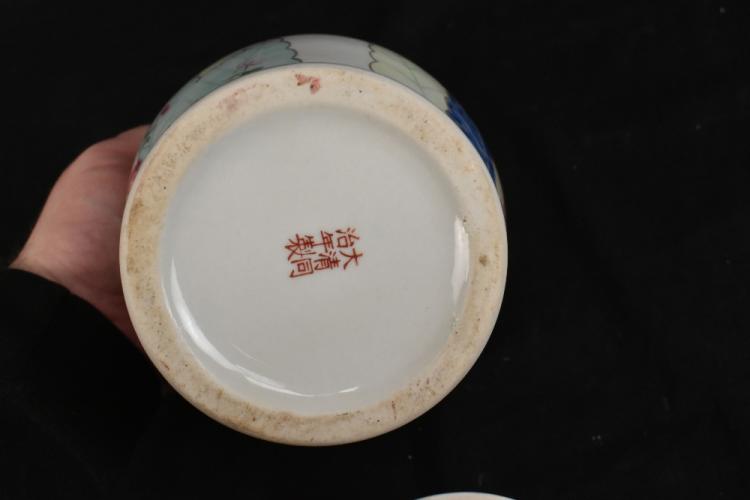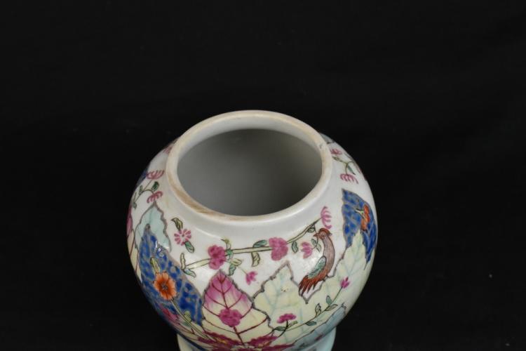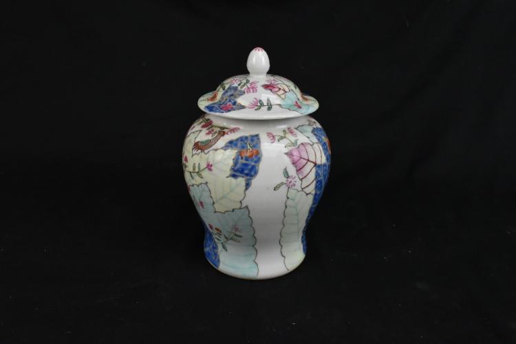 Lot 94A of 1739: A modern Chinese porcelain temple jar and cover decorated in the tobacco leaf pattern, red character mark to underside, height 20cm.