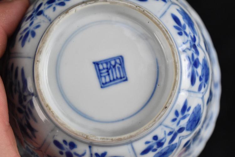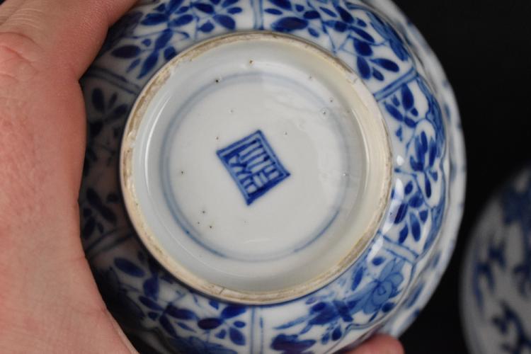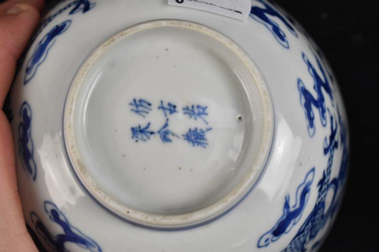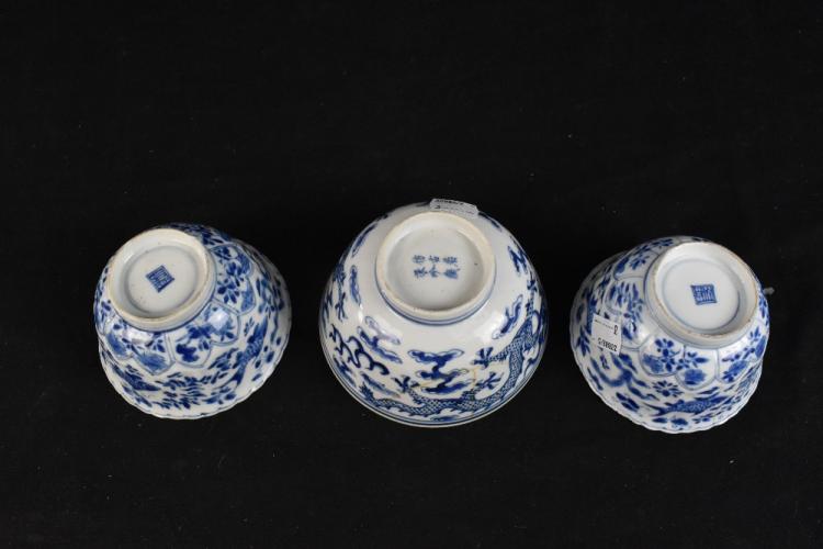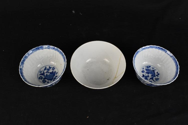Lot 91A of 1739: A pair of 19th century Chinese porcelain bowls, with moulded detailing and decorated with carp and flowers, 11cm diameter, with a blue and white dragon bowl (3).
