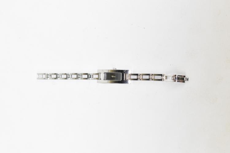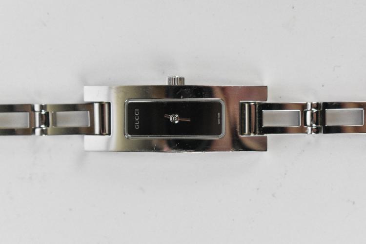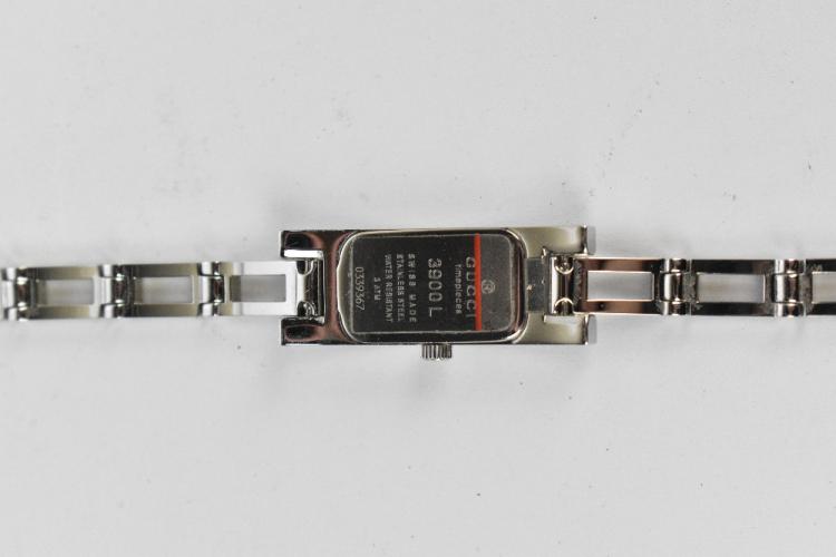 Lot 2 of 3058: GUCCI; a 3900L silver stainless steel lady's quartz watch with Swiss movement and analogue display, no.033967, the watch strap measures 16cm, but has two extra links, to measure 18cm, in original box with authenticity card.