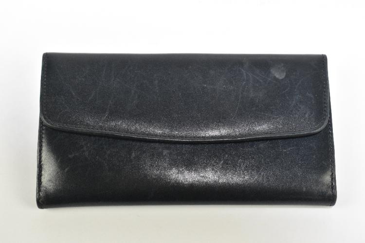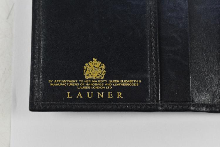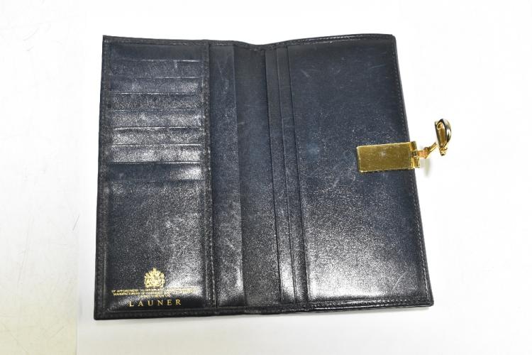 Lot 15 of 3058: LAUNER; a navy blue soft calfskin leather wallet/purse with gold tone stirrup clasp, with card slots for eight or more cards, 17 x 9 x 2cm.