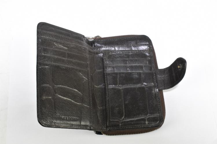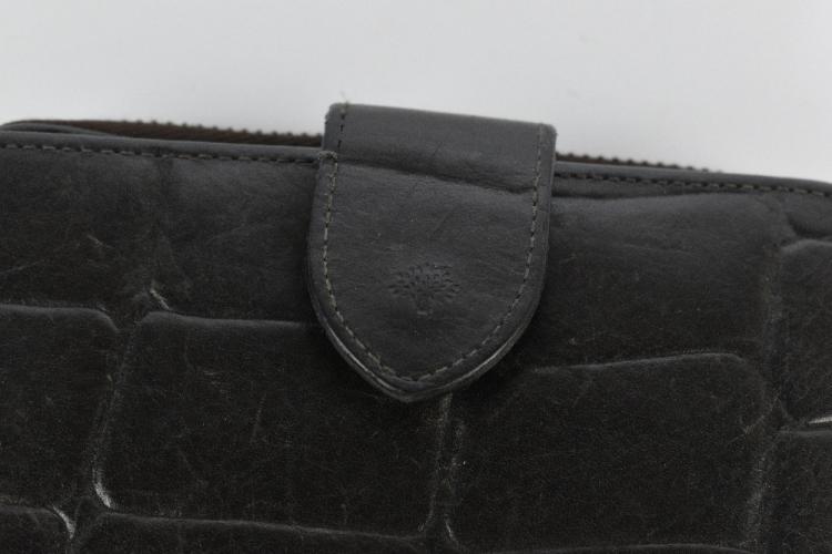 Lot 16 of 3058: MULBERRY; a vintage brown Congo mock croc leather large purse/wallet with gold tone top zip with logoed zip fob, magnetic fastened top wallet with spaces for six or more cards, with Mulberry dust bag, 14 x 9 x 2cm.