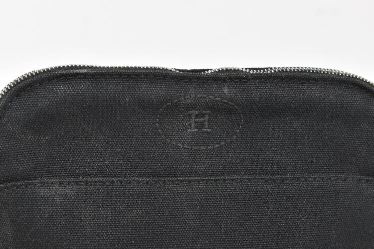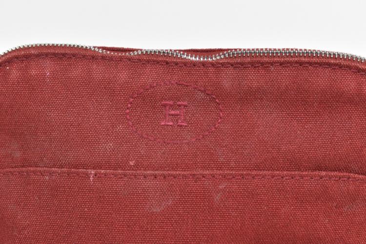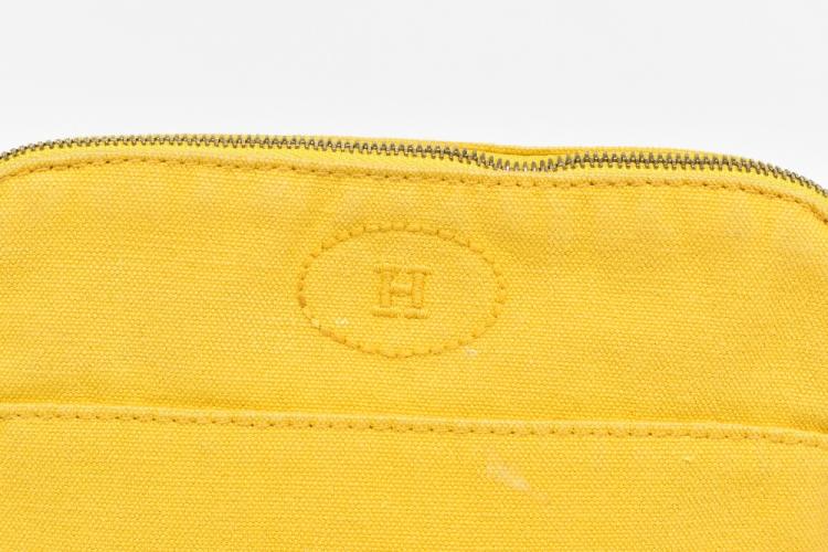 Lot 19 of 3058: HERMÈS; a black Bolide canvas cosmetic pouch/make up bag trimmed with beige calfskin leather, lined, with a silver tone zip top, 20 x 15 x 6cm, with two further similar Bolide cosmetic pouches/make up bags in burgundy red and yellow (3).