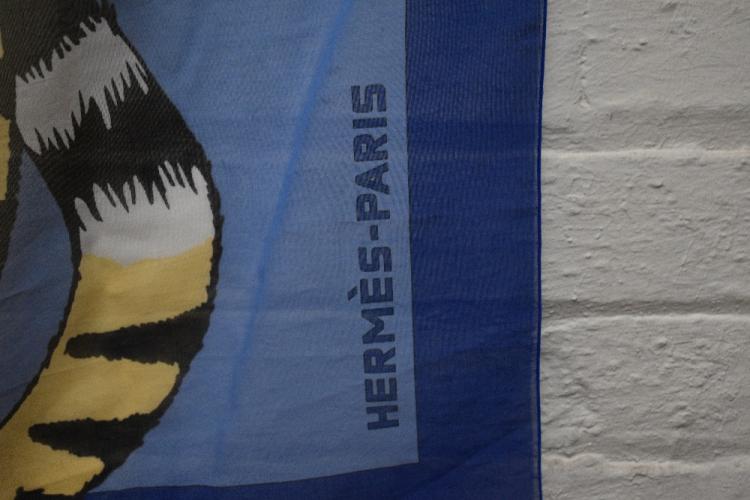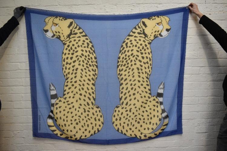 Lot 25 of 3058: HERMÈS; a very large 100% cotton Les Leopards scarf, mainly blue with black and cream leopards, 180cm x 145cm.