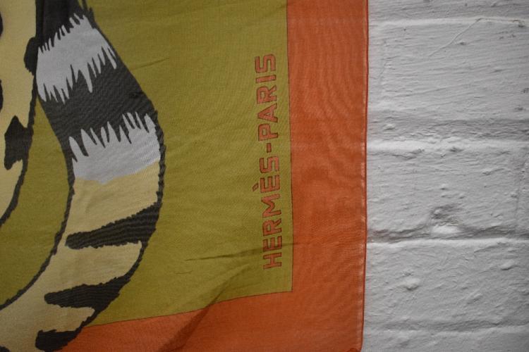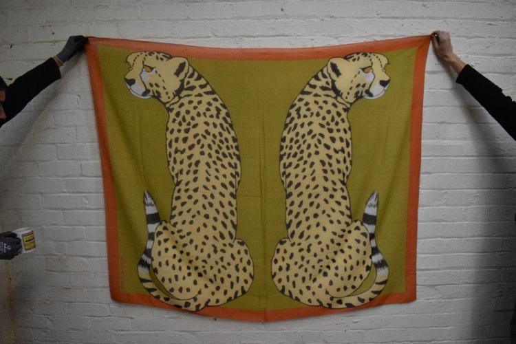Lot 26 of 3058: HERMÈS; a very large 100% cotton Les Leopards scarf, mainly orange/brown with black and cream leopards. 180 x 145cm.