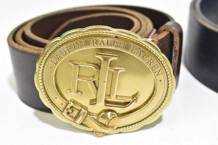 Lot 41 of 3058: RALPH LAUREN; a thick brown leather lady's belt with large gold tone maker's logo buckle, 30inches, together with a blue leather belt with silver tone maker's logo buckle, and a beige brown leather belt with leather and silver tone iconic maker's logo belt buckle, all belts are size S (3).