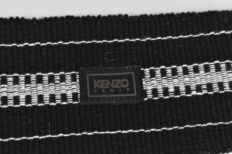 Lot 42 of 3058: KENZO, PARIS; a black and white patterned woven fabric tie belt with black leather trim to ends and maker's logo leather fob, length 183cm, and a black leather three strand waist belt with gold tone buckle and springs, length 84cm (2). Provenance: from a private collection in Monaco.