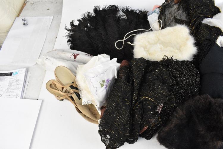 Lot 49 of 3058: A mixed collection of vintage items including two pairs of vintage shoes, one snakeskin, a black feather boa, a large quantity of scarves including a Spanish shawl, a large quantity of gloves including early 20th century makes, a large quantity of cotton, silk and lace vintage handkerchiefs, a white rabbit fur muff, a fur hat, and an early 20th century faux tortoiseshell and large feather fan.