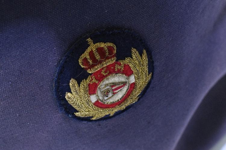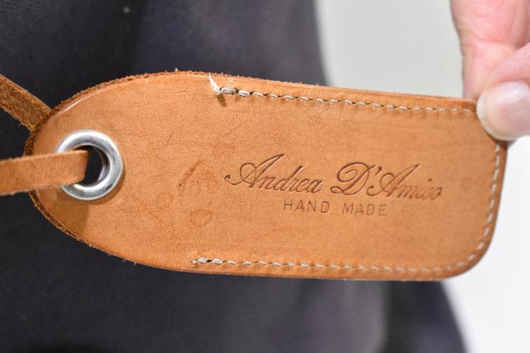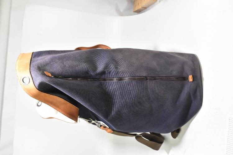 Lot 50 of 3058: ROYAL YACHT CLUB OF MONACO AND ANDREA D'AMICO; a heavy cloth navy holdall/duffle bag trimmed with full grain tan leather, a full zip to the side, a carry handle and removable shoulder strap and an embroidered 'YCM' badged front (missing the drawstring top), 70 x 36 x 23cm (af). Provenance: from a private collection in Monaco.