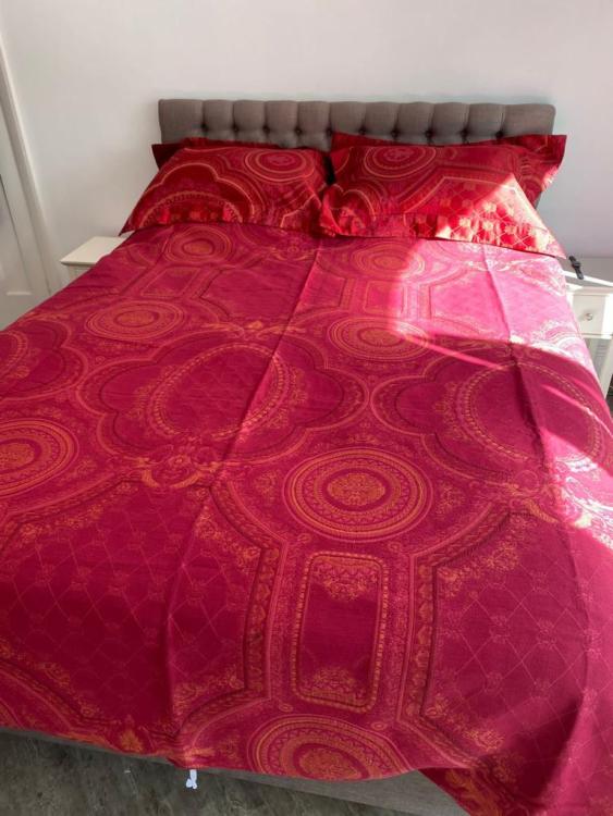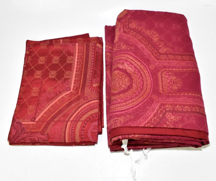 Lot 53 of 3058: HERMÈS; a silk and cotton red jacquard bedding set comprising a large duvet cover, 200 x 245cm and a pair of Oxford style pillow cases, all dry cleaned (3).