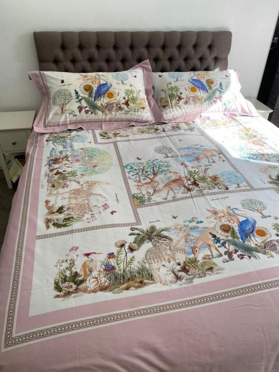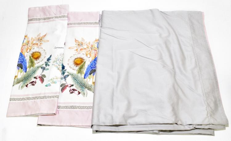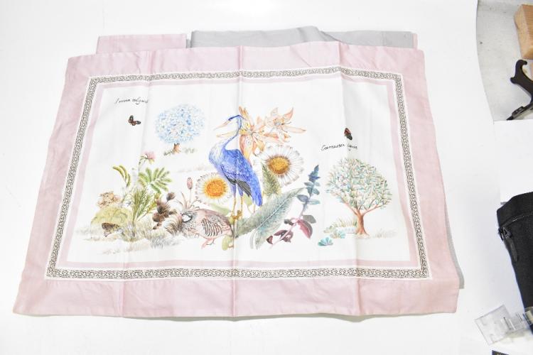 Lot 54 of 3058: HERMÈS; a 100% cotton grey, pink and pastel coloured bedding set, the duvet cover 200 x 245cm, buttoned at the top, and two Oxford style pillow cases, decorated with animals and botanical plants with Latin names, all dry cleaned (3).
