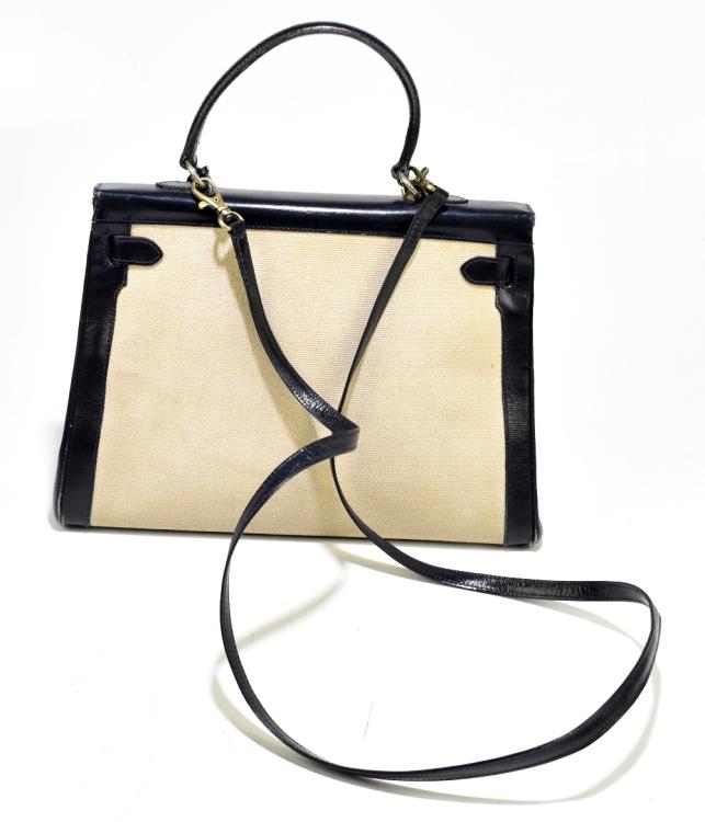 Lot 64 of 3058: A vintage 1950s canvas and box blue leather handbag in the style of a Hermès Kelly 32 bag, with gold tone hardware closure, padlock and keys, top D-shaped handle, and detachable shoulder strap, the interior lined in soft leather with a zip pocket and three further pockets, the base is blue leather with four gold tone button feet, 32 x 23 x 11.5cm.