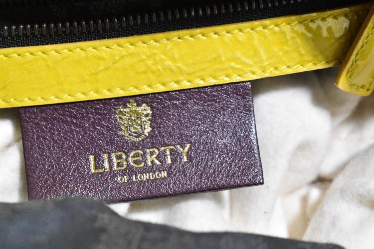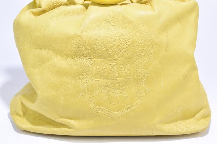 Lot 77 of 3058: LIBERTY; a large yellow leather open Frame Carriage handbag, embossed by Liberty of London, trimmed with yellow patent leather, with brass tone hardware, inside zip pocket and patent leather base, dust bag, 40 x 45 x 15cm.