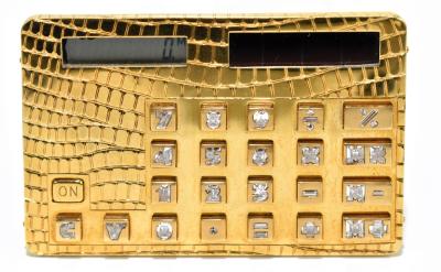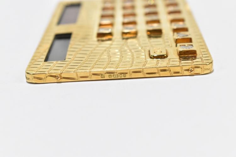 Lot 1485 of 3058: *****WITHDRAWN FROM SALE***** A unique 18ct yellow gold and diamond set calculator, the frame with simulated crocodile skin finish, and with each function button set with an individually cut diamond, 9 x 5.5cm, approx 84.5g, presented in faux crocodile skin wallet.