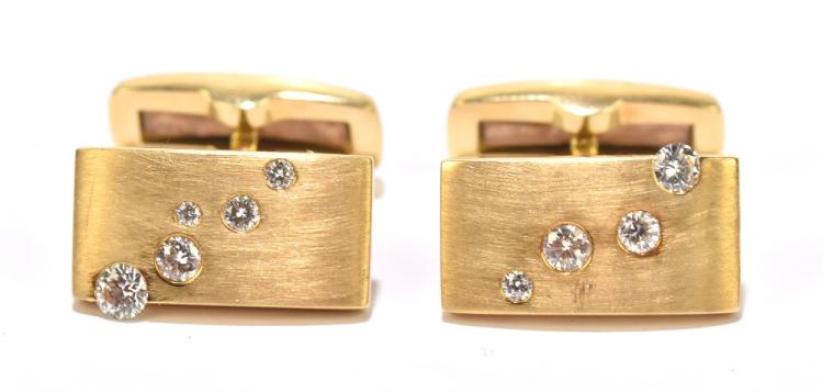 Lot 1488 of 3058: *****WITHDRAWN FROM SALE***** DAVID M ROBINSON; a pair of 18ct brushed yellow gold and diamond cufflinks, each rectangular platform set with five round brilliant cut stones, the largest weighing approx 0.20ct, length of platform 20mm, approx 24.8g, presented in David Robinson box.