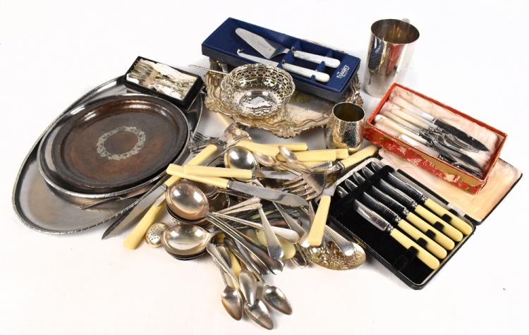 Lot 2017 of 3058: A collection of 19th century and later silver plated items, to include a salver, a pierced dish and flatware (qty)