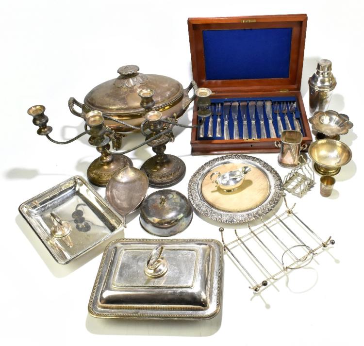 Lot 2019 of 3058: A group of assorted silver plate including a large twin handled lidded tureen raised on cast feet, mahogany cased part canteen of fish knives and forks, a pair of candelabra, etc.
