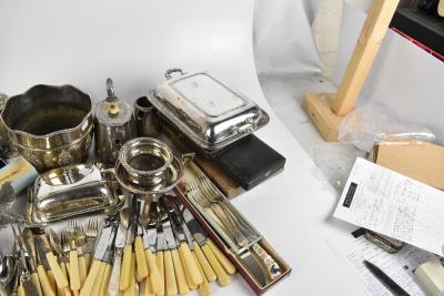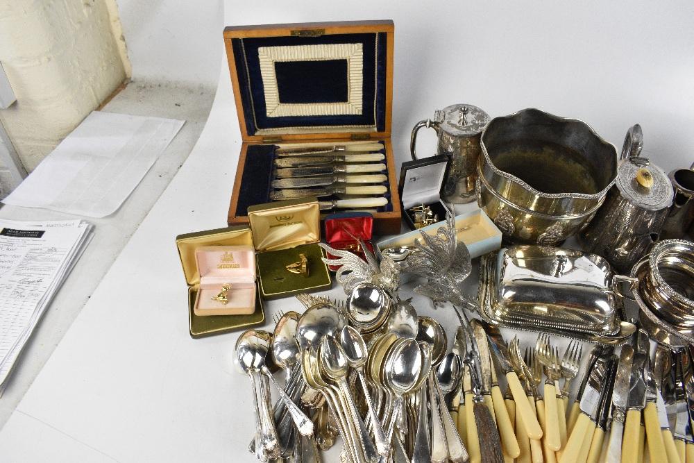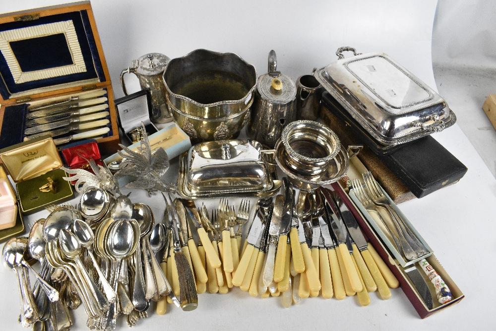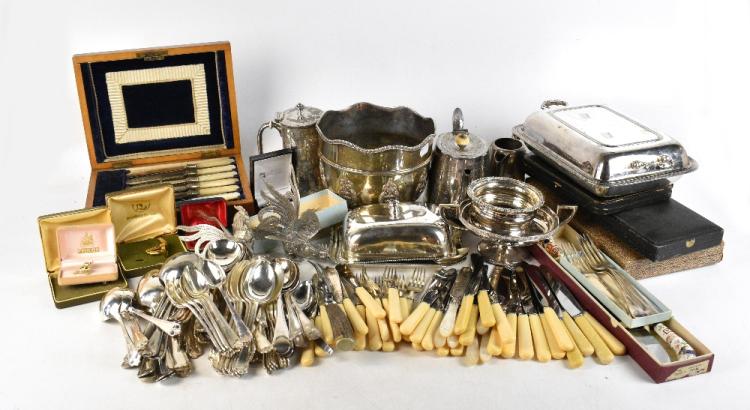 Lot 2020 of 3058: A collection of 19th century and later silver plated items, including a jardinière, a bottle coaster, entrée dish and cover, a butter dish and cover, a twin handled circular pedestal dish, a selection of gentleman's gilt metal cufflinks and a small collection of costume jewellery (quantity).