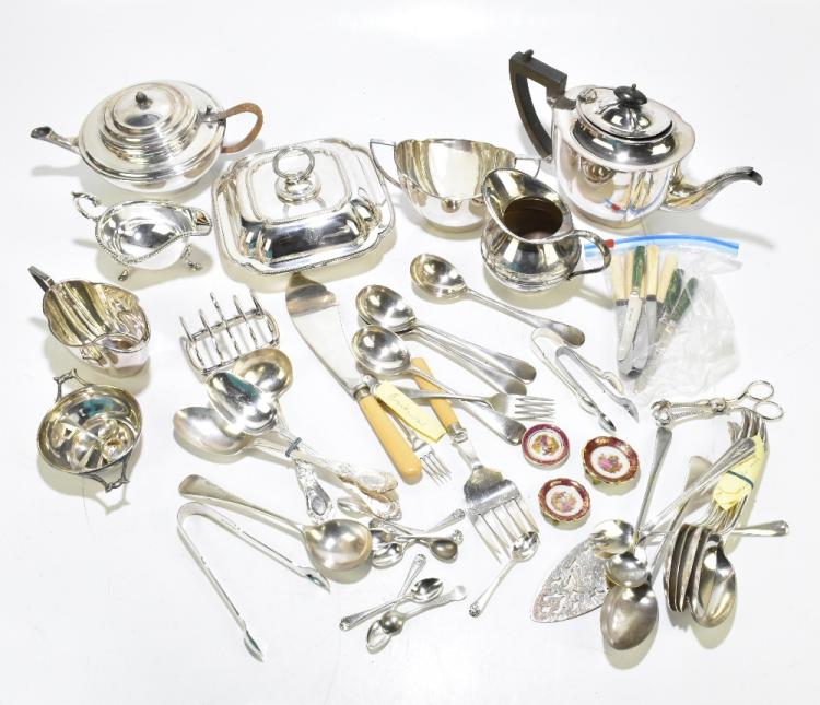 Lot 2021 of 3058: A collection of 19th century and later silver plated wares to include an Elkington lobed square entrée dish and cover, a three piece tea service and various loose cutlery, with a silver plated part canteen of Fiddle pattern flatware and a part set of fish eaters (qty).
