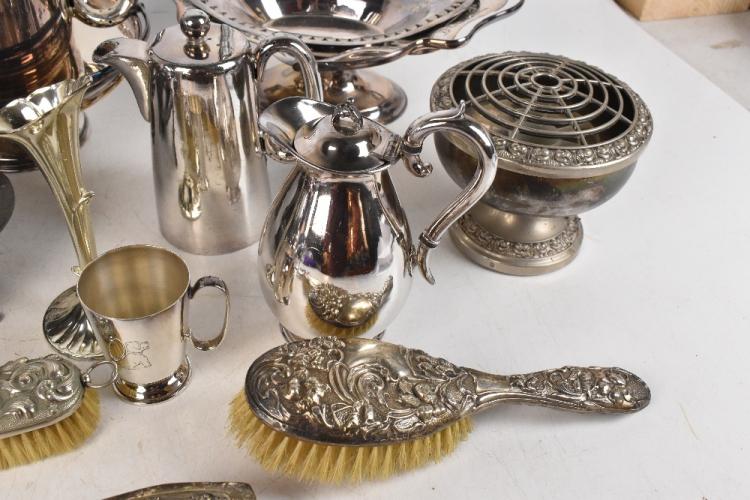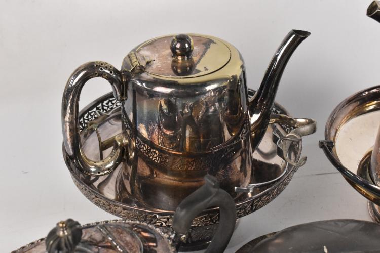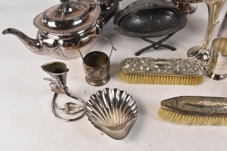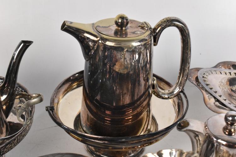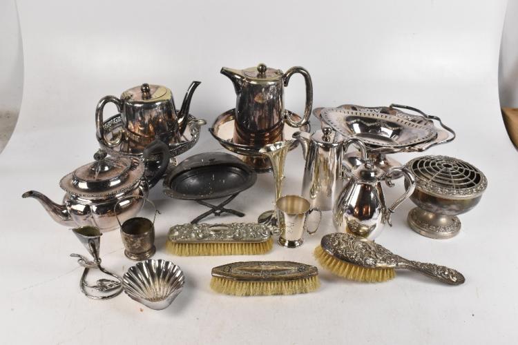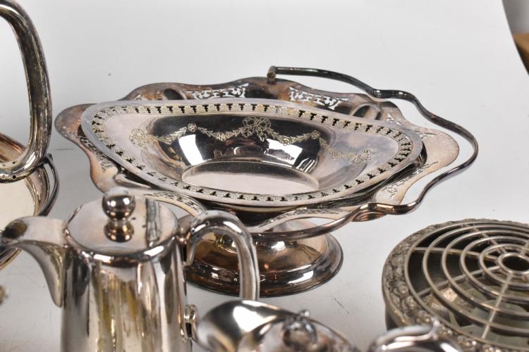 Lot 2028 of 3058: A collection of 19th century and later plated items, to include a three piece tea set and baskets (quantity). PROVENANCE: The Raymond Rush Collection. Mr Rush was an engineer, farmer and lay preacher who lived at Golden Cross Farm in Siddington, Cheshire. He was also a historian, broadcaster, author and speaker who regularly gave talks on local history, agricultural history and historic curios. In addition, he was also an accomplished maker of corn dollies.