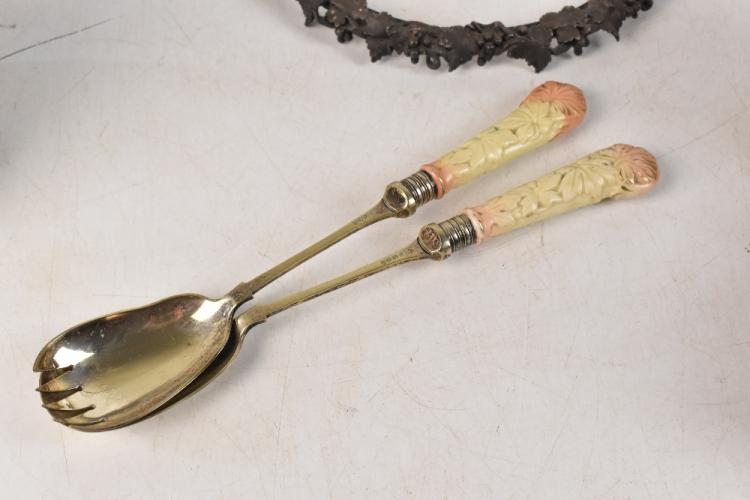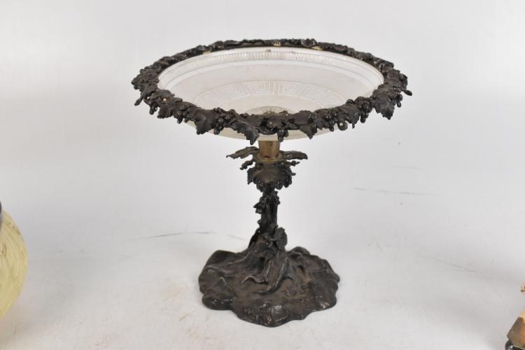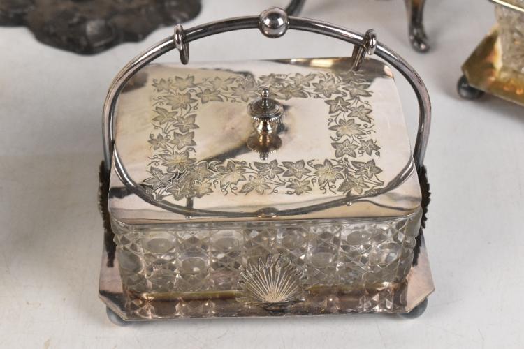 Lot 2031 of 3058: A 19th century silver plated table centrepiece, with moulded glass top set with a fruiting vine border, on naturalistic base, height 23cm, (the rim detached from the glass) with a sardine dish and cover, a biscuit barrel and hinged cover, a part cruet, a plate mounted biscuit barrel and cover and a Locke & Co Worcester salad bowl and pair of servers (8). PROVENANCE: The Raymond Rush Collection. Mr Rush was an engineer, farmer and lay preacher who lived at Golden Cross Farm in Siddington, Chesh