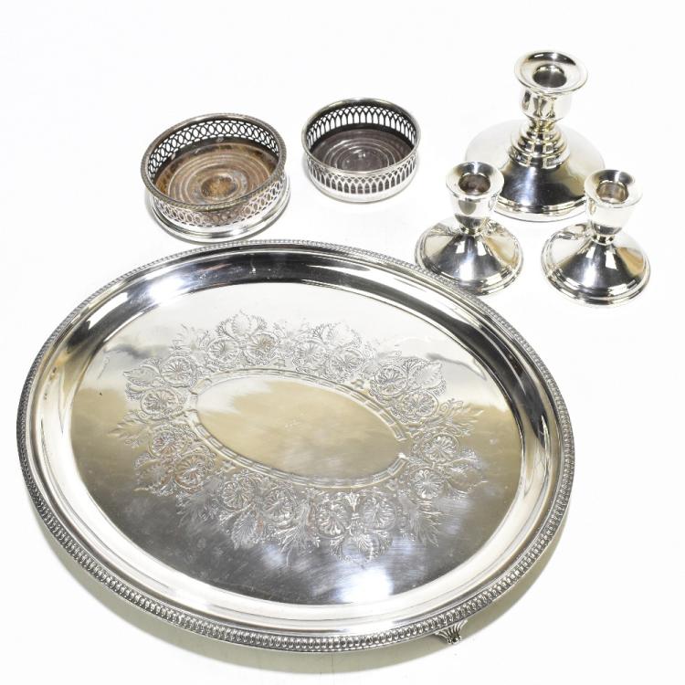 Lot 2034 of 3058: A small collection of assorted silver plate including a pair of squat candlesticks, two wine coasters and an oval tray, (6).