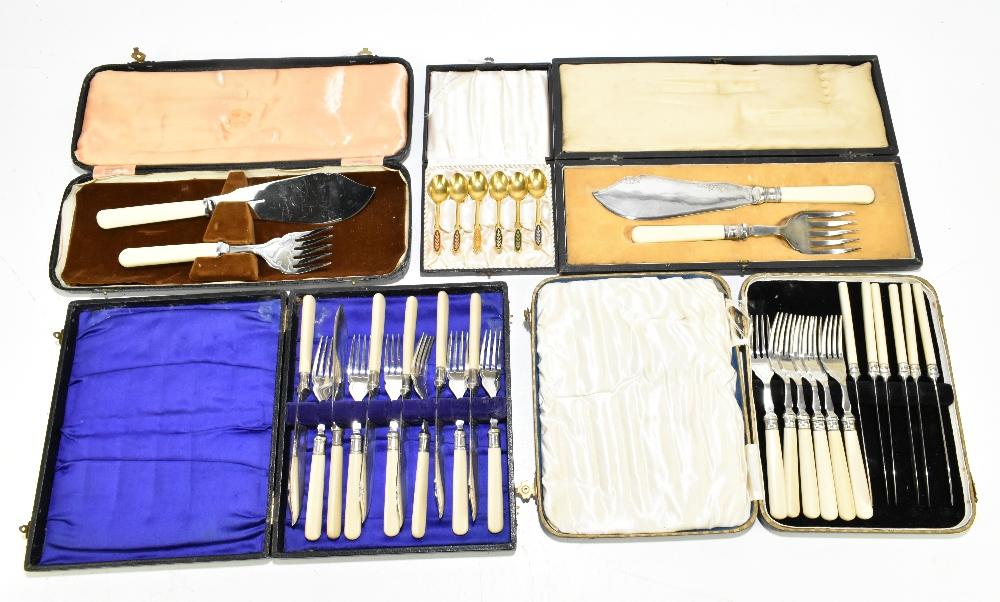 Lot 2037 of 3058: MEKA DENMARK; a cased set of six gilt metal coffee spoons with enamel terminals, stamped marks, length of each 8.5cm, and four further boxed silver plated flatware sets.