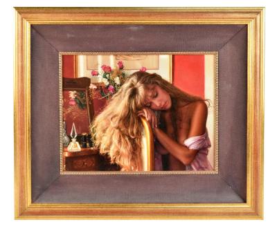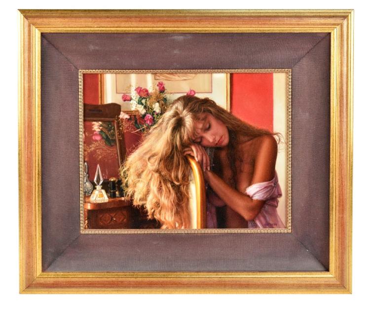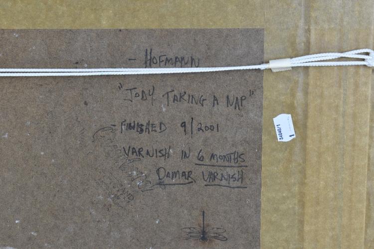 Lot 2924 of 3058: DOUGLAS HOFMANN (American, born 1945); oil on board, 'Jody Taking A Nap', signed, inscribed verso and bearing Halcyon Galleries label verso, 27 x 34cm, framed.