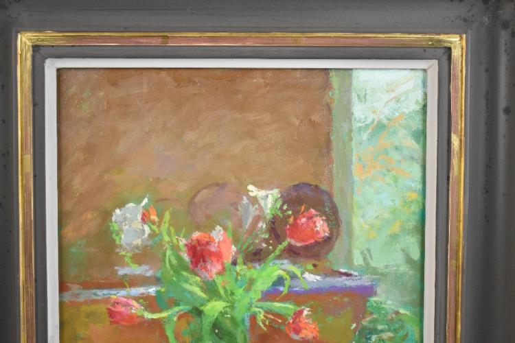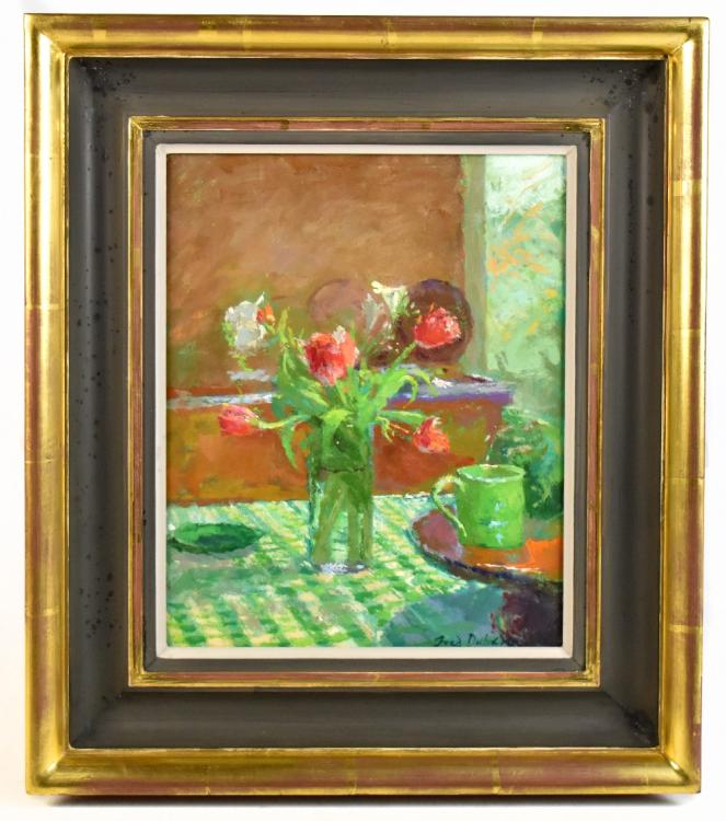 Lot 2930 of 3058: FREDERICK DUBERY; oil on board, still life of flowers in a vase on a kitchen table, signed lower right, 26 x 21.5cm, framed. (D)