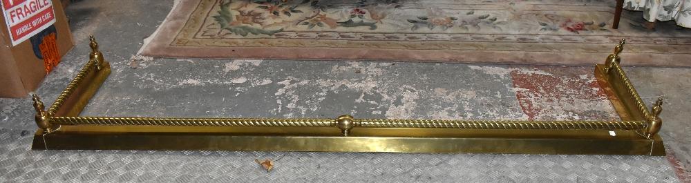 Lot 3273 of 3058: A large reproduction brass fender with turned column mount, and four ball finials, width 210, depth 52cm.