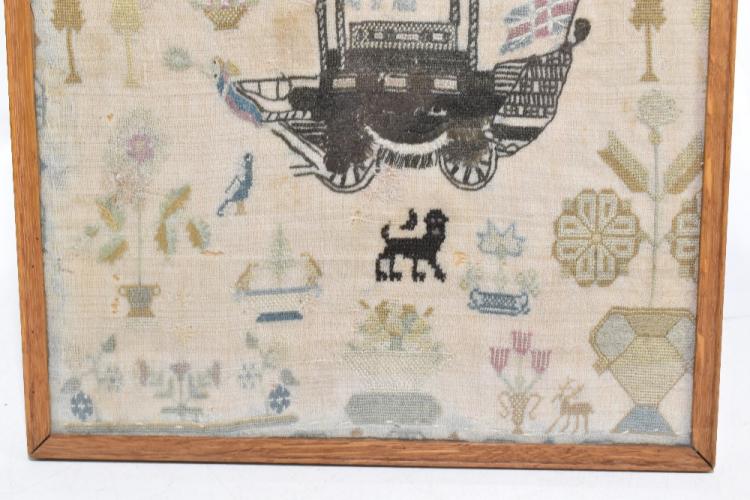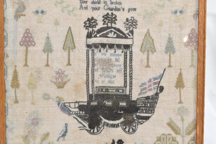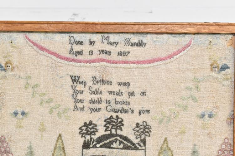 Lot 3275 of 3058: An unusual early 19th century sampler 'Done by Mary Hambly, aged 13 years 1807', with poem 'Weep Britons weep, Your sable weeds put on, Your shield is broken and your guardian's gone', the centre of the image depicting a funerary cart inscribed 'AD. Vis. Nelson, Gladiator Fell at the Moment of Victory off Trafalgar...' [?], within a border of animals, flowers and cherubs, 35 x 26cm, framed and glazed.