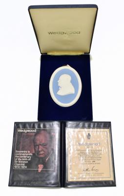 Lot 3503 of 3058: WEDGWOOD; a boxed limited edition pale blue and white jasperware plaque to commemorate a century of the birth of Sir Winston Churchill  30th November 1874, 281/1000, complete with certificate.