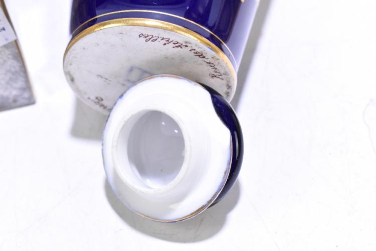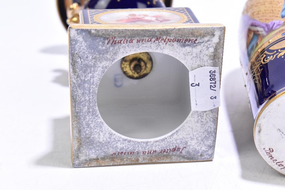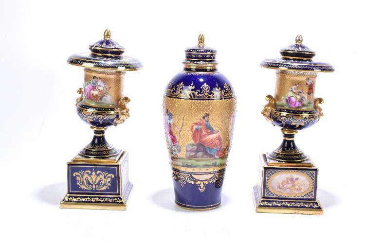 Lot 3514 of 3058: VIENNA; a pair of porcelain cobalt blue gilt heightend and hand painted urns and covers and a similar ovoid vase, the vase and the urns signed F. Neumann and titled to base, each bearing the blue beehive mark, height of vase 22cm, height of urns 22.5cm.