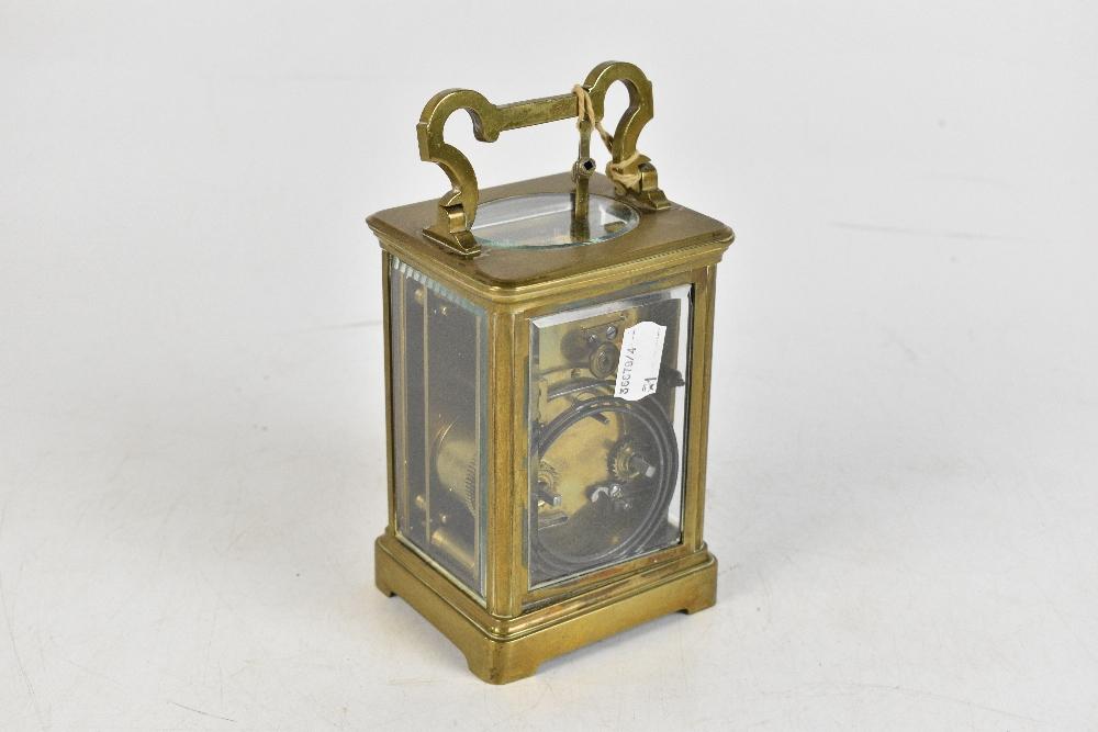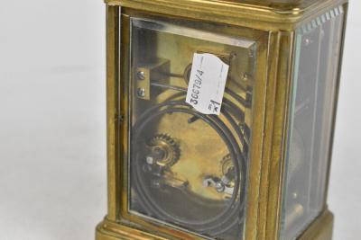 Lot 3571 of 3058: A late 19th century brass carriage timepiece, the brass dial with an enamelled Arabic numeral chapter ring and movement striking on a gong, height 13.5cm.