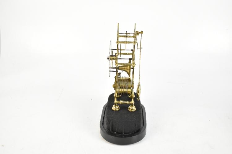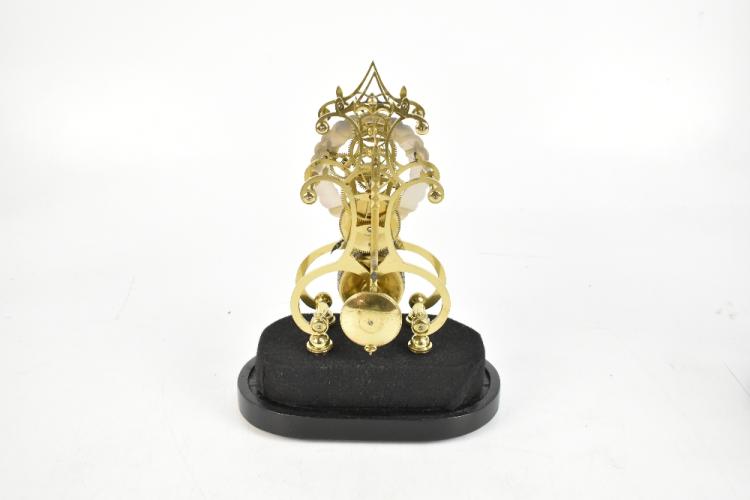 Lot 3577 of 3058: An early 20th century brass skeleton clock with applied silvered chapter ring with black Roman numerals, signed Shepperley & Pierce, Nottingham, with fusee movement, in glass dome and with later ebonised stand, overall height 33cm.