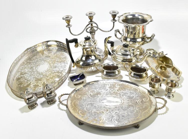 Lot 2021A of 3058: A small selection of silver-plate including four piece tea service, twin handled gallery tray, wine cooler etc.