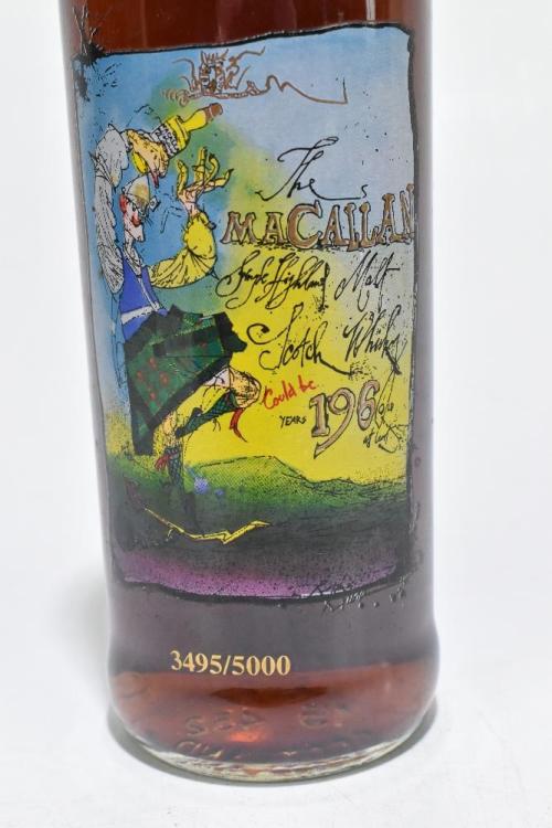 Lot 1 of 2131: WHISKY; a single limited edition bottle of Macallan Single Highland Malt Scotch Whisky, bottled in 1996 for the 35th anniversary of the satirical magazine Private Eye, the label, designed by Ralph Steadman, reads ‘could be 196 years old’, numbered 3495/5000.