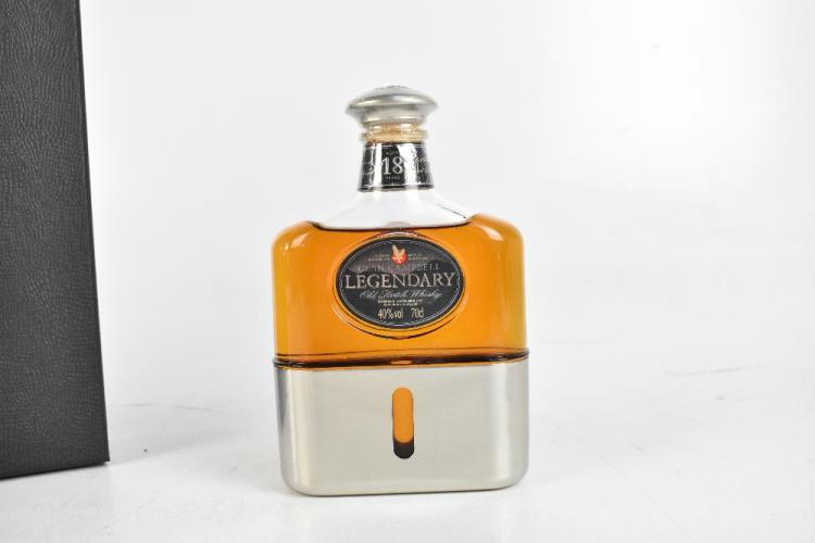 Lot 69 of 2131: WHISKY; a cased 70cl bottle of Clan Campbell Legendary 18 year old Old Scotch Whisky, the bottle modelled as a spirit flask with cup base, with original letter.