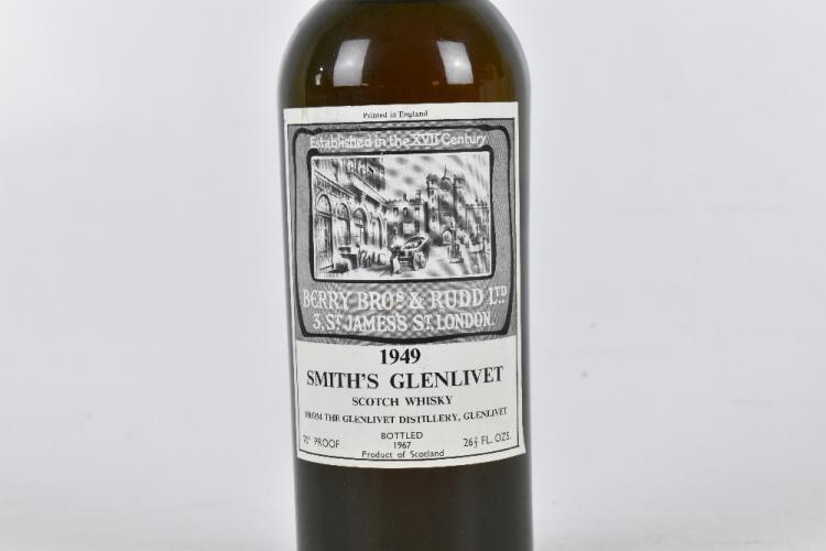 Lot 102 of 2131: WHISKY: a single bottle of Smith’s Glenlivet 1949 Scotch Whisky, bottled in 1967, 70%.