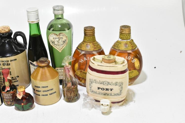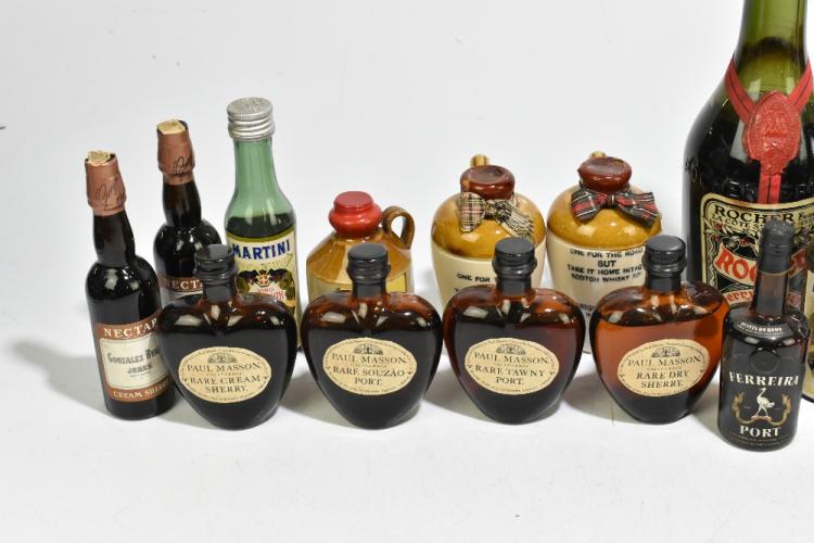 Lot 204 of 2131: MIXED SPIRITS; a group including Honeymoon Ye Old Liqueur Mead, two small Haig's Dimple and various miniatures including Paul Masson Rare Cream Sherry, Ferreira White Port, Martini, etc, also some vacant small sized decanters.