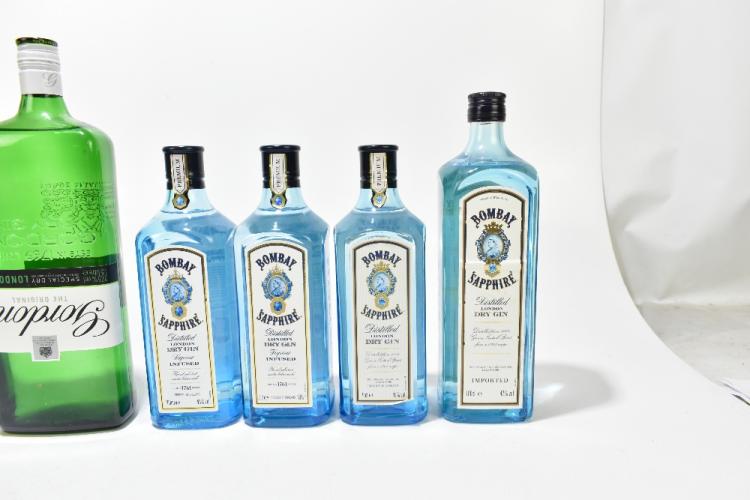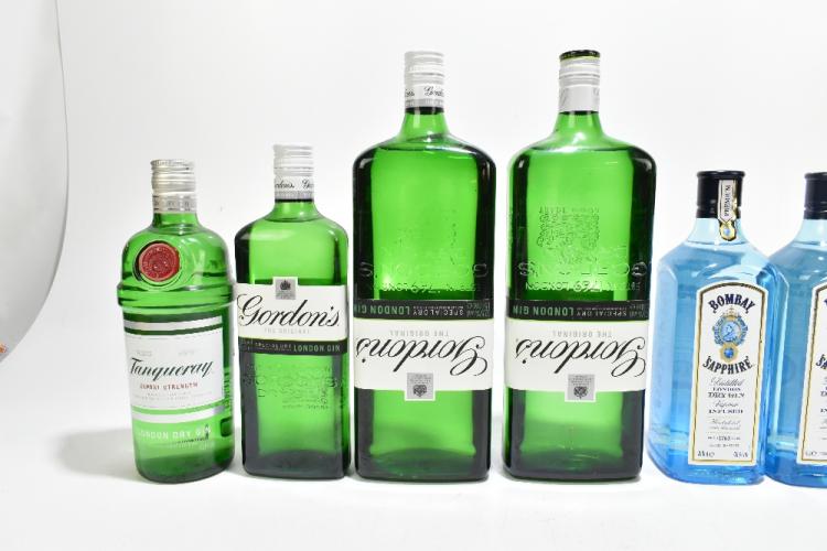 Lot 215 of 2131: GIN; a group of eight bottles including one 1l and three 70cl bottles of Bombay Sapphire, two 1.5l Gordon's, etc.