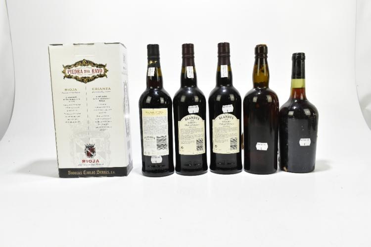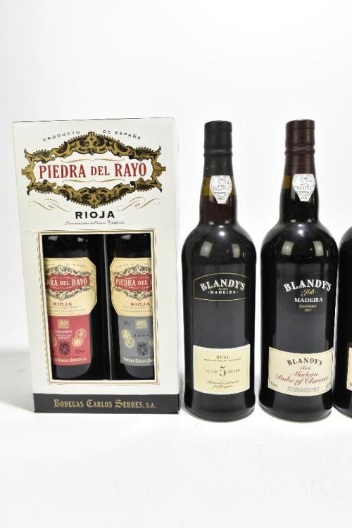 Lot 244 of 2131: MADEIRA; three bottles of Blandy's Bual Medium Rich Madeira, one example aged 5 years, a bottle of spirit with the remains of the label entitled Amontillado dated 1878, inscribed 'bottled by Arthur H Godfrey & Co Ltd 11 Arundel Street London', a boxed presentation set of two bottles of Piedra Del Rayo Rioja and a bottle of Moulin-A-Vent (6).