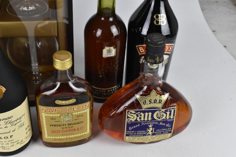 Lot 253 of 2131: MIXED SPIRITS; including a bottle of San Gil Grand Armagnac, one bottle of Grand Fine Champagne Cognac, Napoleon French Brandy, one bottle of Cointreau, one bottle of Croft Original, one bottle of Monte Cristo, a presentation box of Monnet Cognac, etc (13).