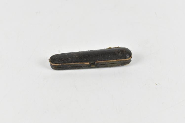 Lot 1024 of 2131: A 9ct rose gold and guilloche enamel Art Deco cheroot holder with amber tip, with Greek key decoration to the enamel, length 8cm, with a further cheroot holder and a silver plated casket inscribed Jeanne D'Arc (3).
