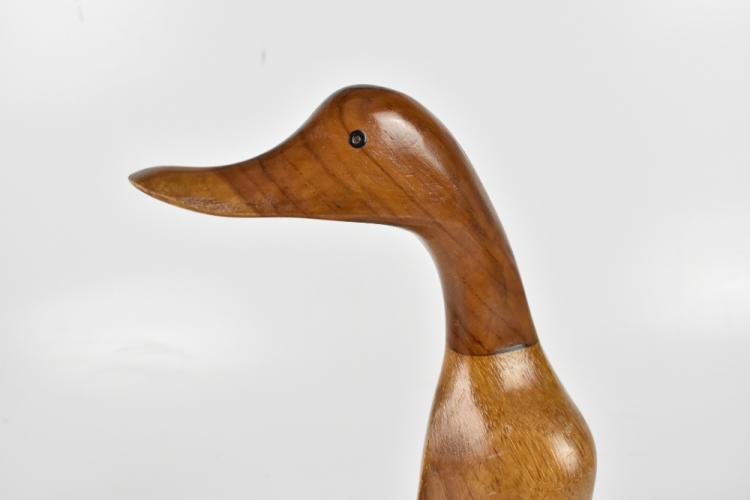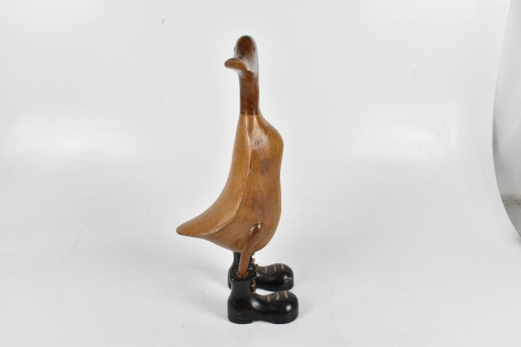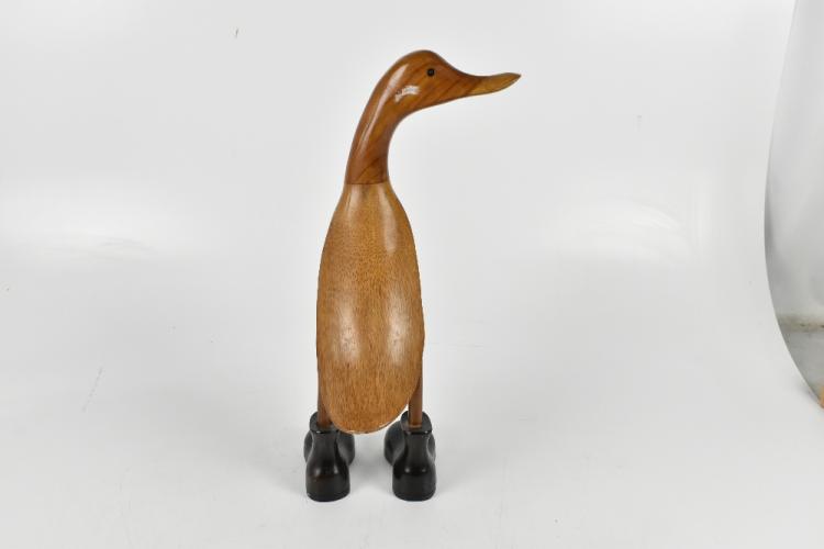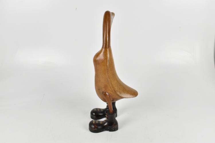 Lot 1032 of 2131: A novelty contemporary carved and wooden polished model of a duck wearing boots, height 45.5cm.