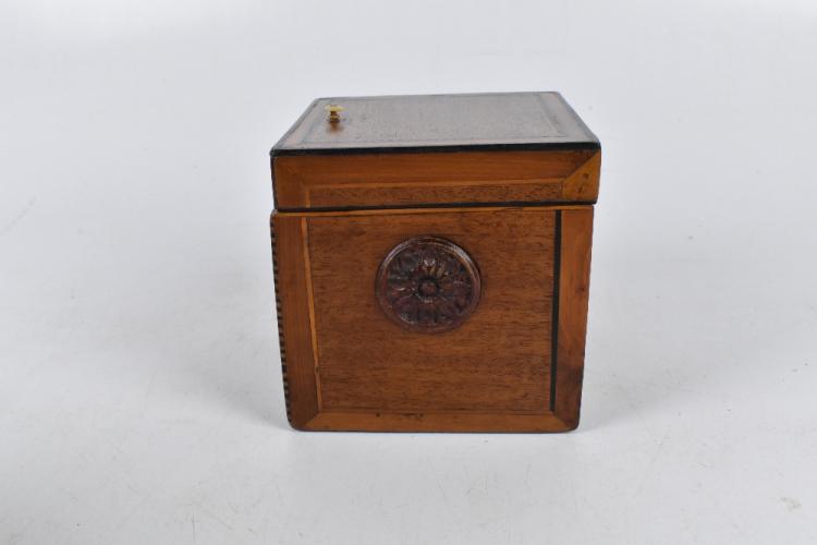 Lot 1051 of 2131: A George III inlaid mahogany tea caddy of rectangular form with matched moulded glass liner, with two 19th century rosewood tea caddies, each with twin divides to the interiors, raised on bun feet (3).