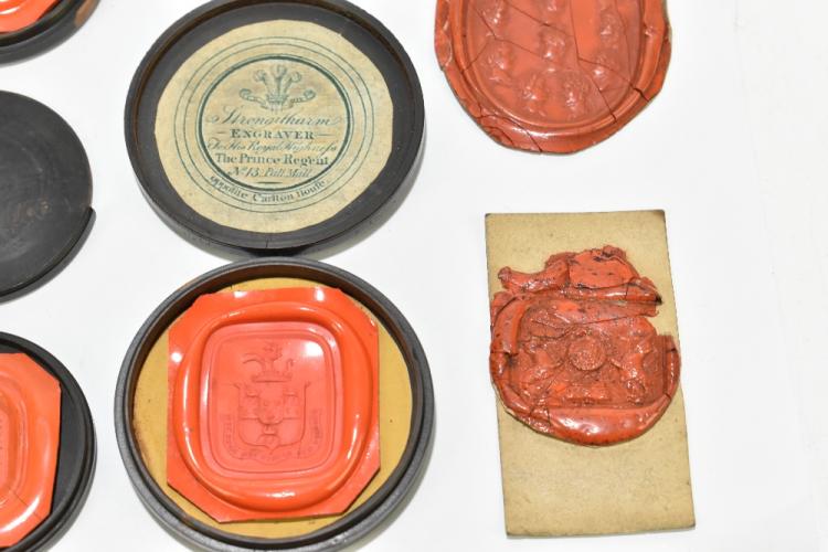 Lot 1061 of 2131: Four wax seal stamps, three examples with turned wooden handles, with an assortment of wax seals and holders, including a rosewood example (15).