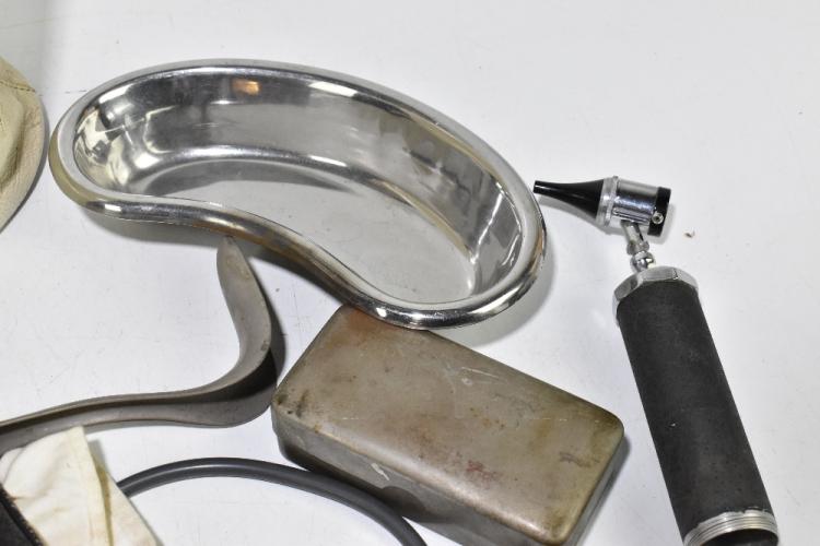 Lot 1066 of 2131: A bag containing an assortment of dentist's equipment and accessories including metal dishes, a lidded jar stamped 'Fitzwell', various tools, etc.